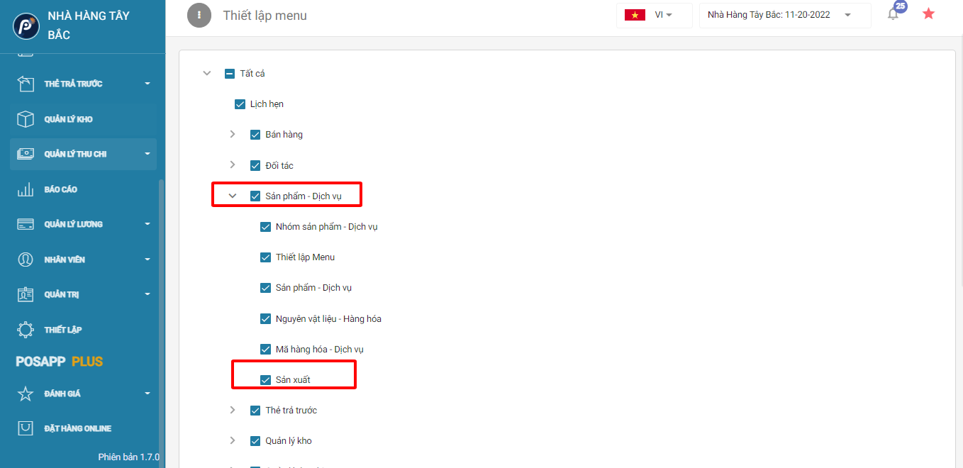 **Bước 2:** Tìm tới dòng Sản phẩm - Dịch vụ show ra và chọn Sản xuất > Lưu lại