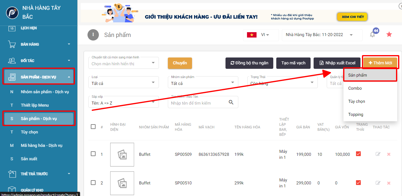 **Bước 4:** Tại đây mình sẽ phải tạo ra các nvl trước, tại mục Sản phẩm- Dịch vụ > thêm mới > sản phẩm > Tắt cho phép bán lẻ > bật quản lý kho là đã tạo thành công NVL