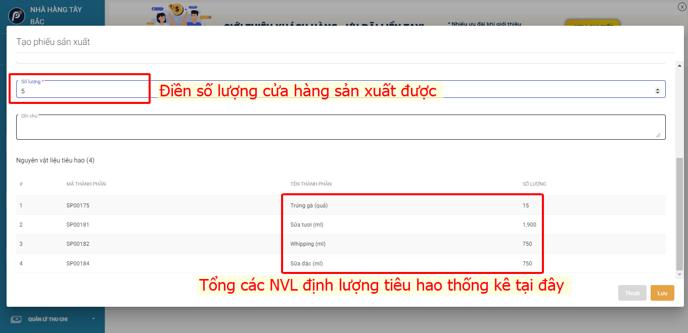 **Bước 11:** Điền số lượng muốn sản xuất (số lượng này sẽ xuất hiện tại quản lý kho, bán bánh Flan sẽ trừ thẳng vào số lượng tồn kho này)\