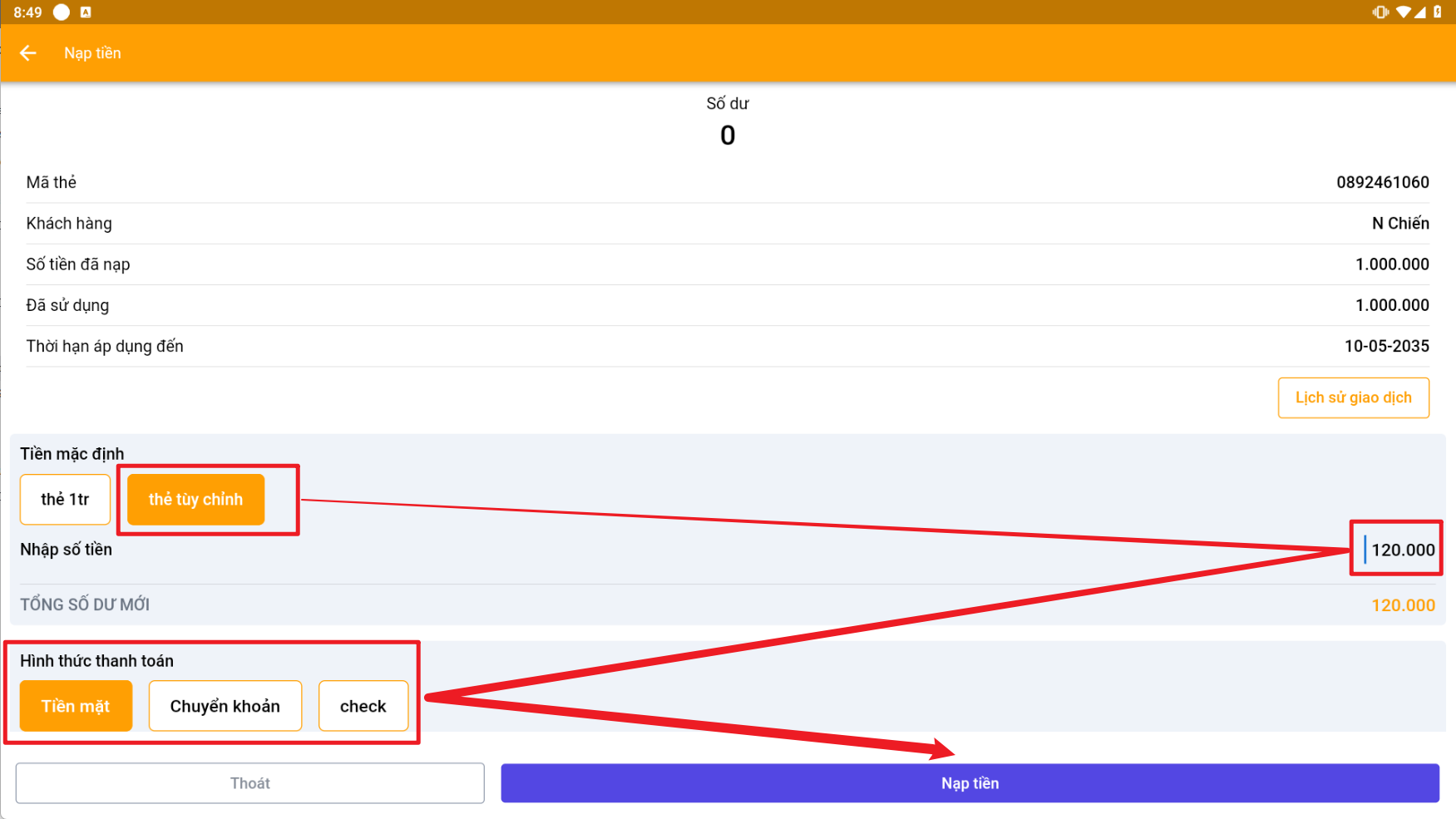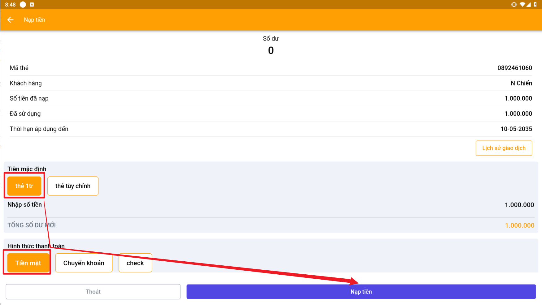 Nạp tiền thành công máy in sẽ in ra phiếu nạp tiền nếu có máy in đồng thời thẻ của khách tiền sẽ được cộng vào