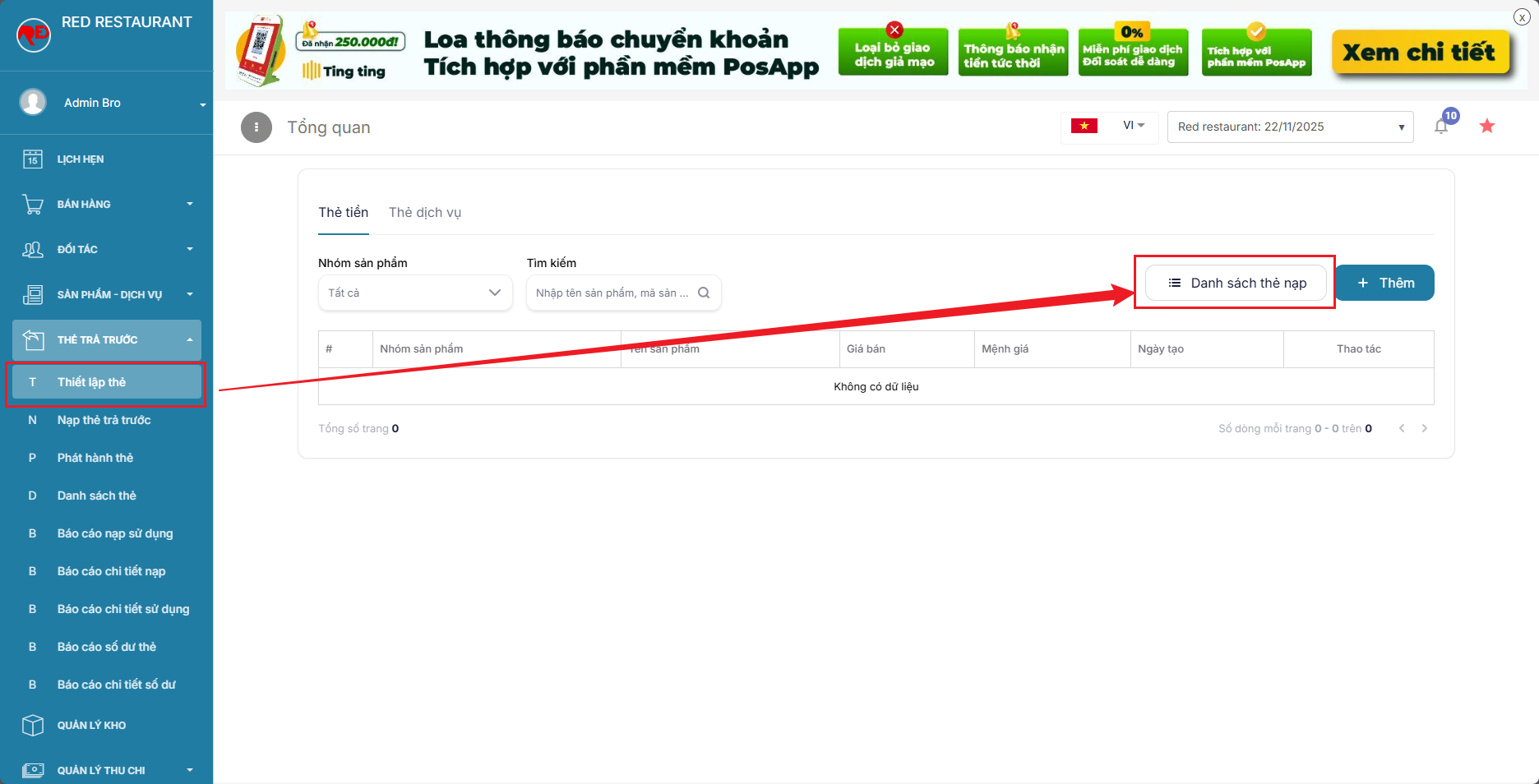 Tại thẻ trả trước > thẻ trả trước > Danh sách thẻ nạp