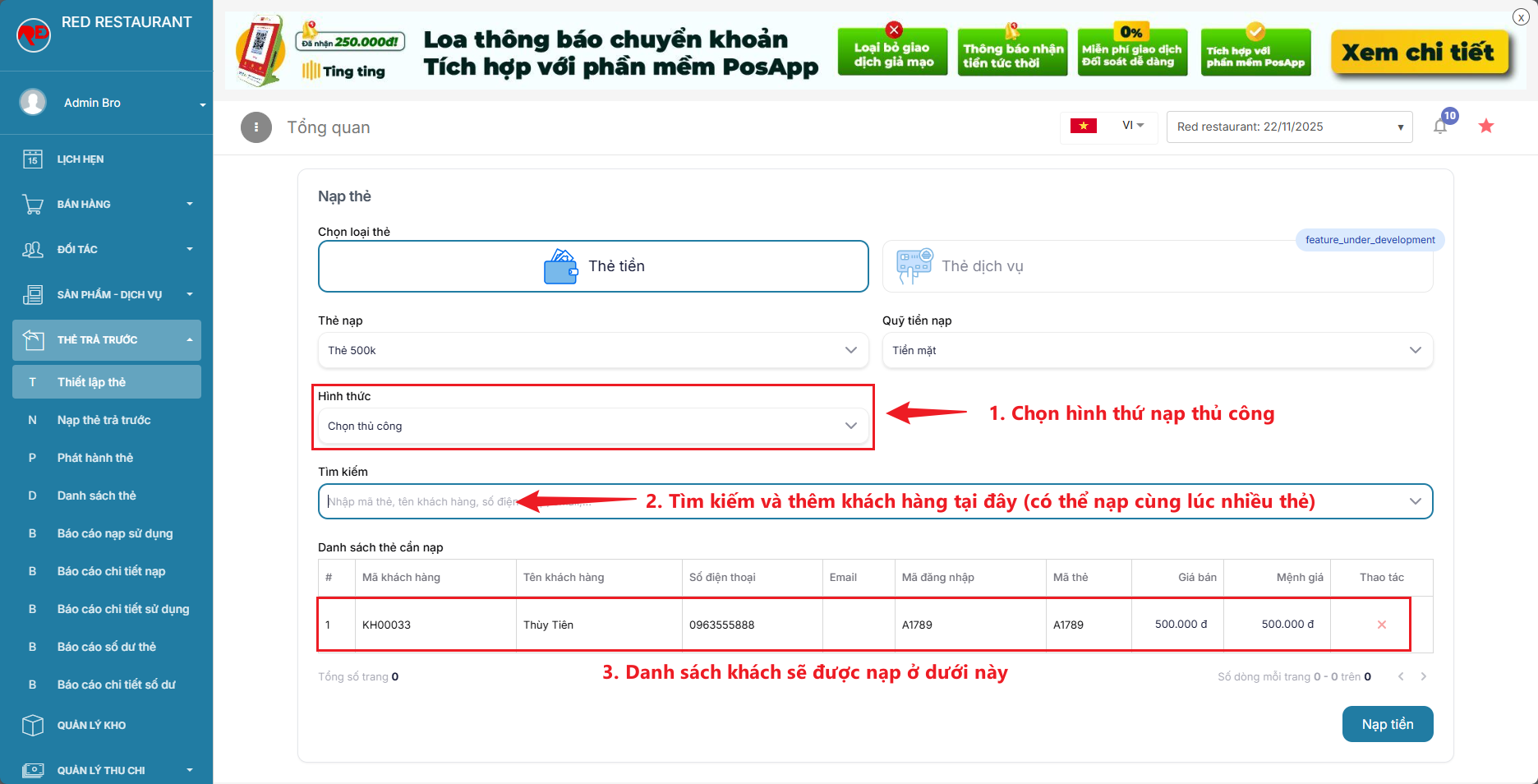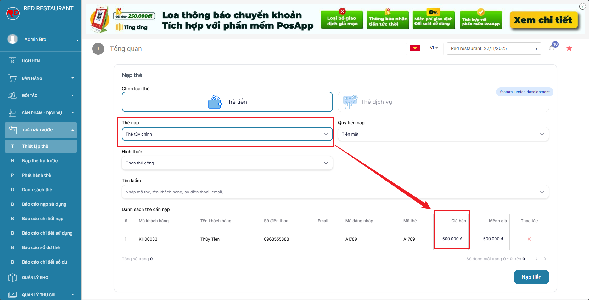 NẠP TIỀN VÀO THẺ TRẢ TRƯỚC (Giúp khách hàng nạp tiền vào thẻ để chi tiêu tại quán, nếu thẻ khi phát hành đã có tiền theo mệnh giá phát hành thì có thể sử dụng được luôn, còn thẻ chưa có tiền thì phải nạp tiền vào thẻ)
