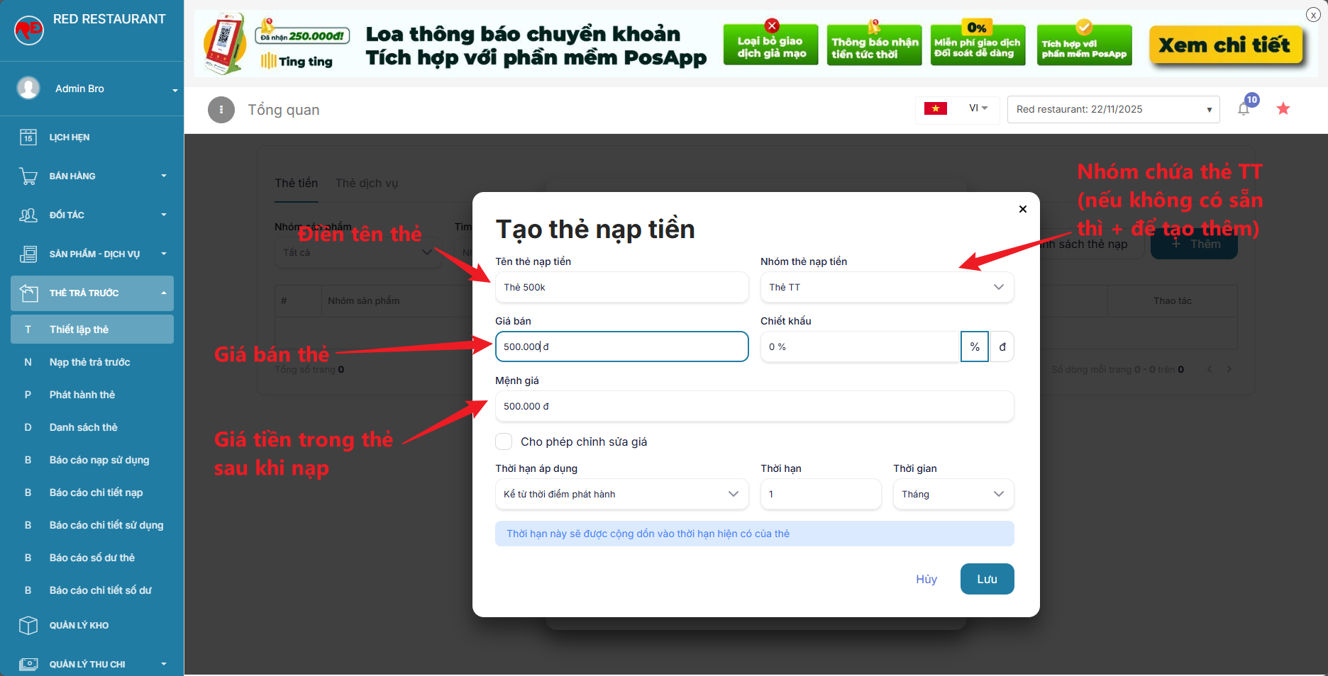Điền thông tin của thẻ tiền (ví dụ hình dưới đây là cách tạo thẻ nạp cố định 500k)