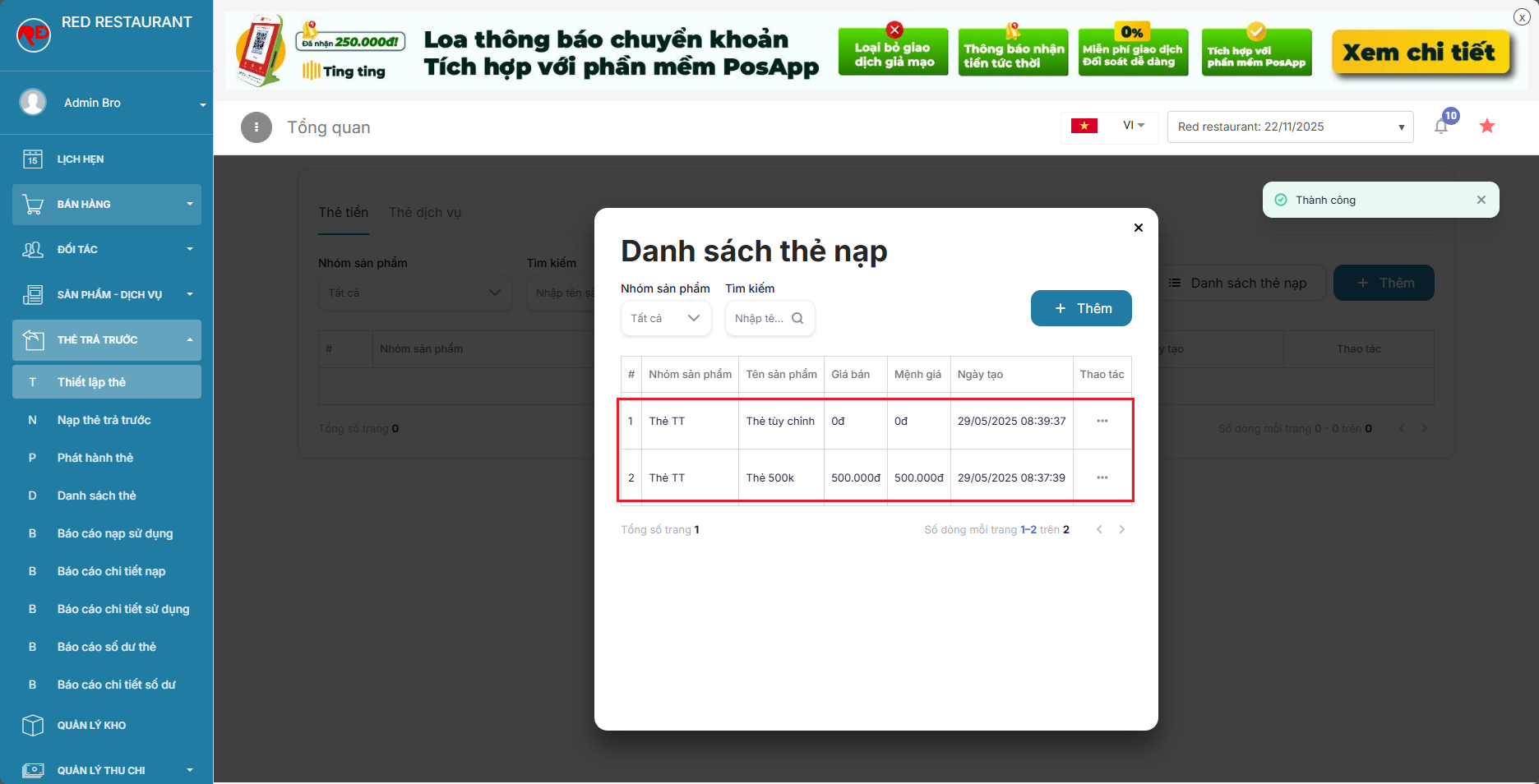 Tạo xong lưu lại ta sẽ được 2 thẻ để nạp cho khách. 1 thẻ cố định 500k và 1 thẻ tùy chỉnh