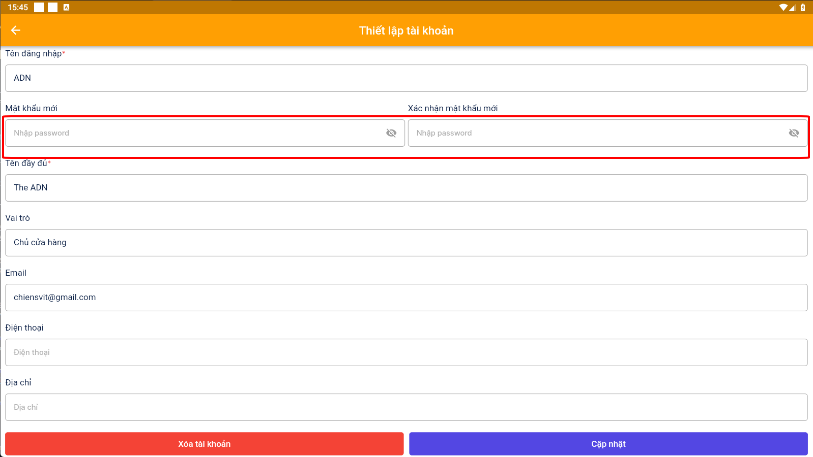 Lưu ý: Khi thay đổi mật khẩu các thiết bị đang đăng nhập trước đó sẽ không bán được hàng, hoặc bị đăng xuất. để tiếp tục vui lòng đăng nhập lại theo mật khẩu mới
