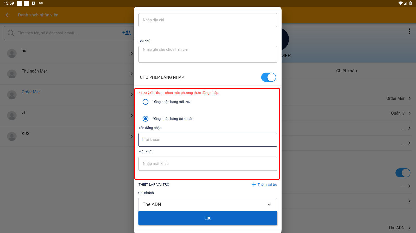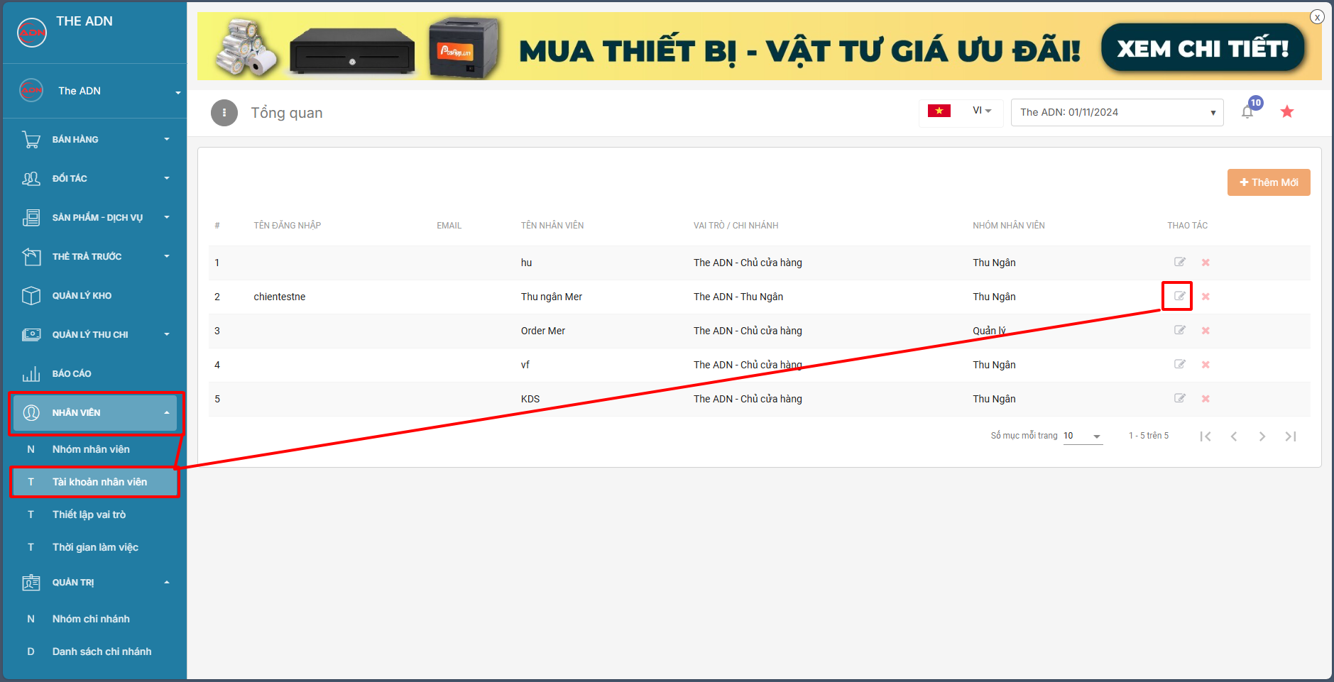 B5: Tại đây bạn có thể thay đổi tên nhân viên, mật khẩu, hoặc vai trò,... của nhân viên đó rồi lưu lại