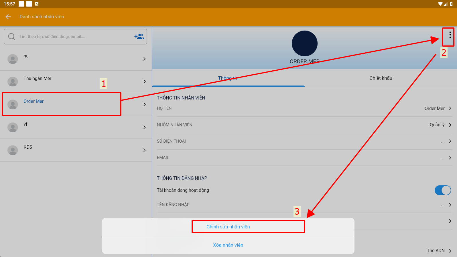 B4: Chọn vào nhân viên muốn chỉnh sửa hoặc xóa > chọn dấu 3 chấm góc phải > chọn chỉnh sửa