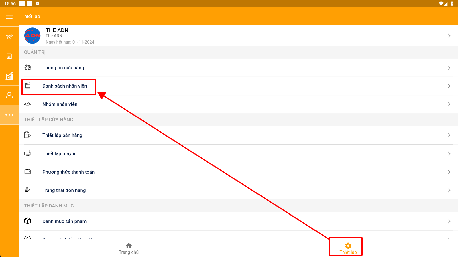 B3: Chọn mục thiết lập > danh sách nhân viên<br>