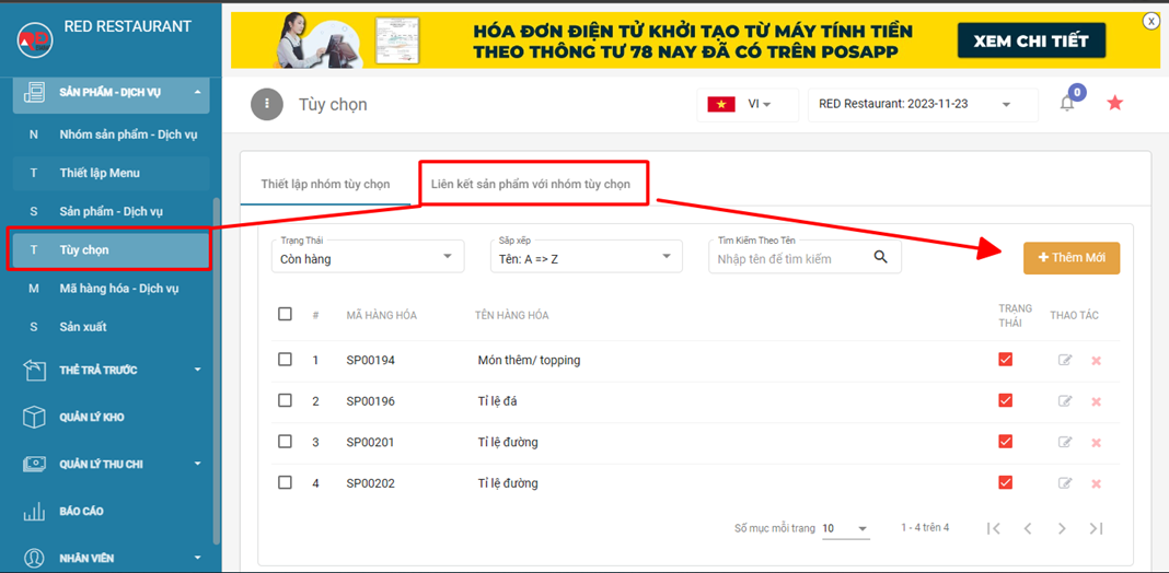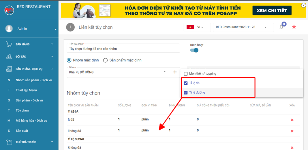 Tại mục Sản phẩm - dịch vụ > tùy chọn sẽ thấy các nhóm topping, tùy chọn ở đây