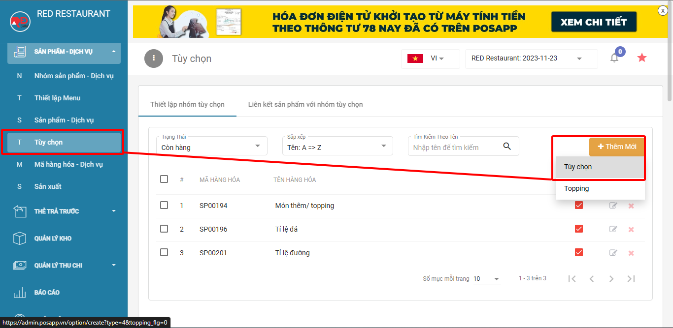 Chọn thêm mới > thêm mới topping