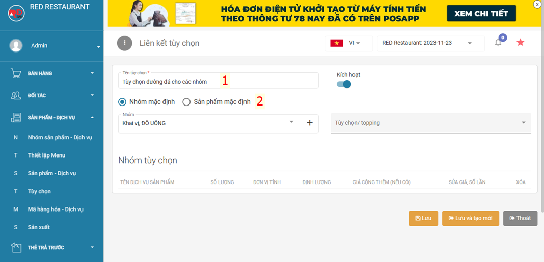 \- Điền tên topping > tắt cho phép bán lẻ > chọn nhóm để quản lý
