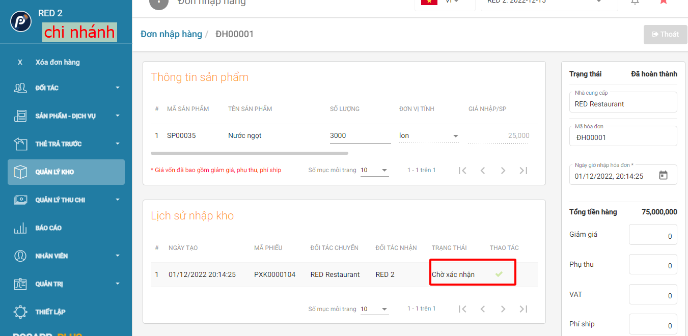 Tại tài khoản chi nhánh chọn quản lý kho > đơn nhập hàng