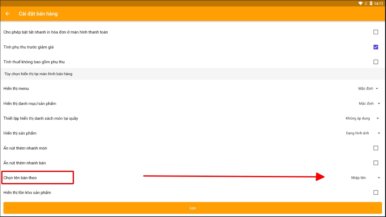 Tại mục chọn tên bàn theo > chuyển sang "Nhập tên" > Lưu lại<br>